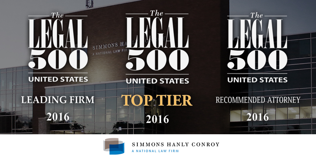 Simmons Hanly Conroy is one of only seven law firms ranked in its category in the 2016 edition of the U.S. Legal 500 referral guide that surveys corporate counsel for their law firm and lawyer recommendations.